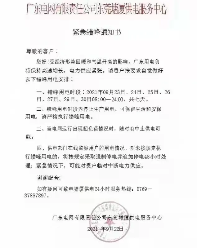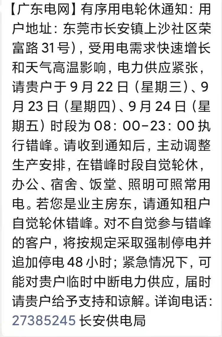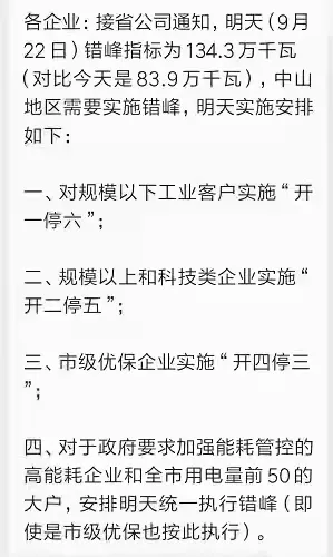 廣東電網通知顯示,于9月16日起執(zhí)行“開二停五”限電措施,錯峰期間,保安負荷保留在總負荷15%以下,錯峰時間為7:00-23:00。若不配合,將面臨10天查封處理?。?!
