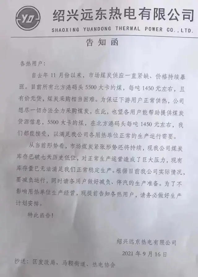 浙江兩家熱電廠發(fā)布通告稱,由于電煤猛漲至1450元/噸,并且有價無貨,因此,將不得不拉閘限電。