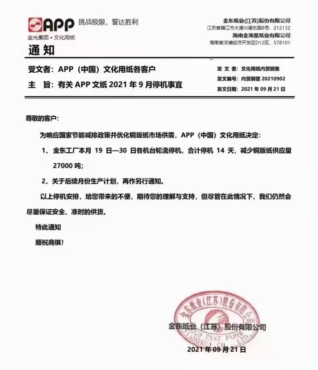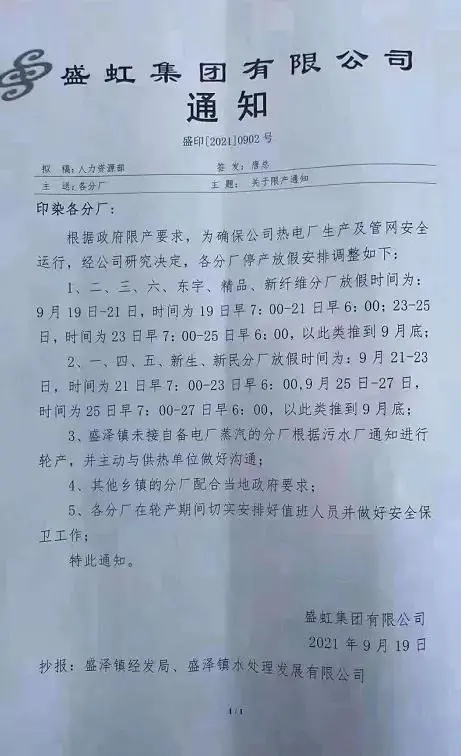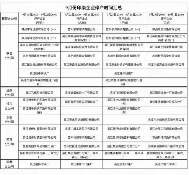 從江蘇吳江地區(qū)傳出的一份印染傳上來停產時間匯總來看,企業(yè)普遍是開二停二。在南通,有企業(yè)發(fā)布了長達17天的放假通知,在泰州,多數企業(yè)被要求從16號開始停工到月底。在常州,有企業(yè)被要求停產8天。在鎮(zhèn)江,APP文化紙機總計停機14天。